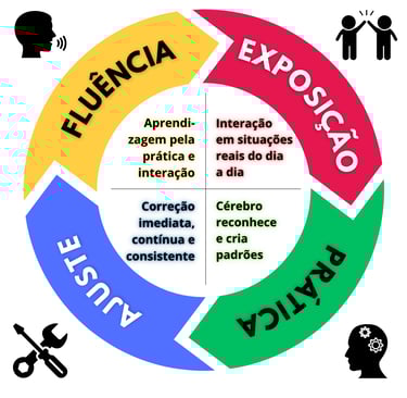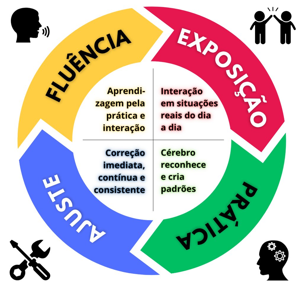 Depois, começou a praticar esses padrões: tentou se comunicar, cometeu erros, testou novas formas de se expressar. E, ao longo do tempo, foi ajustando tudo com base nas correções e feedback das pessoas que o cercavam. E com apenas 5 anos de idade – e um cérebro parcialmente desenvolvido – você já era completamente fluente em português. Sem nunca ter aberto uma apostila, decorado regras ou assistido uma única aula.